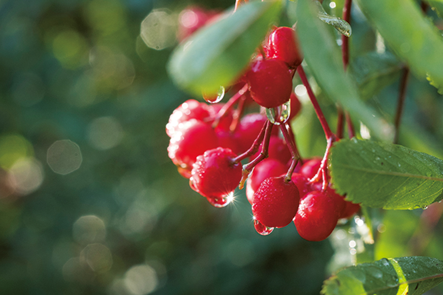 朝露で輝くナナカマドの実。これは秋の訪れを知らせる“赤色”だ。