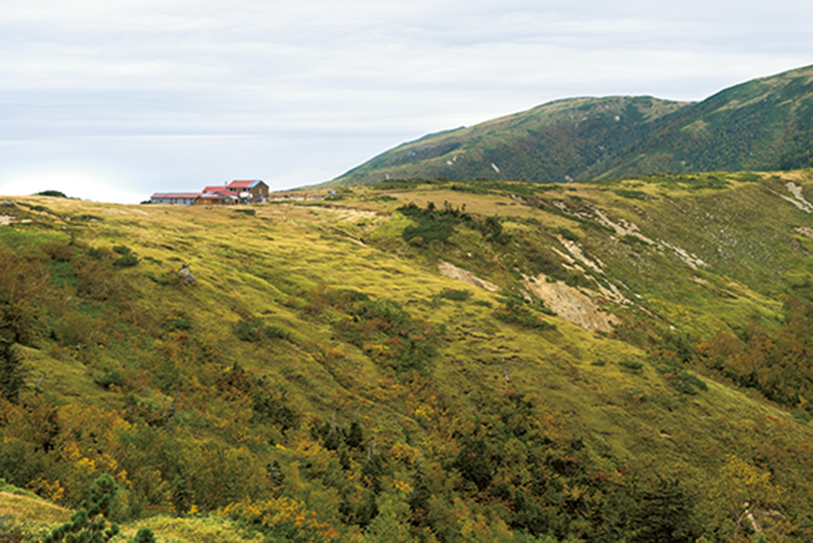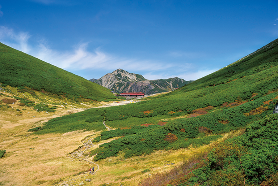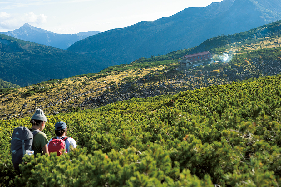 新穂高温泉から歩くこと約20時間、ついに到着だ。雲ノ平山荘は四方を雄大な山に囲まれた、なだらかな台地に建つ。