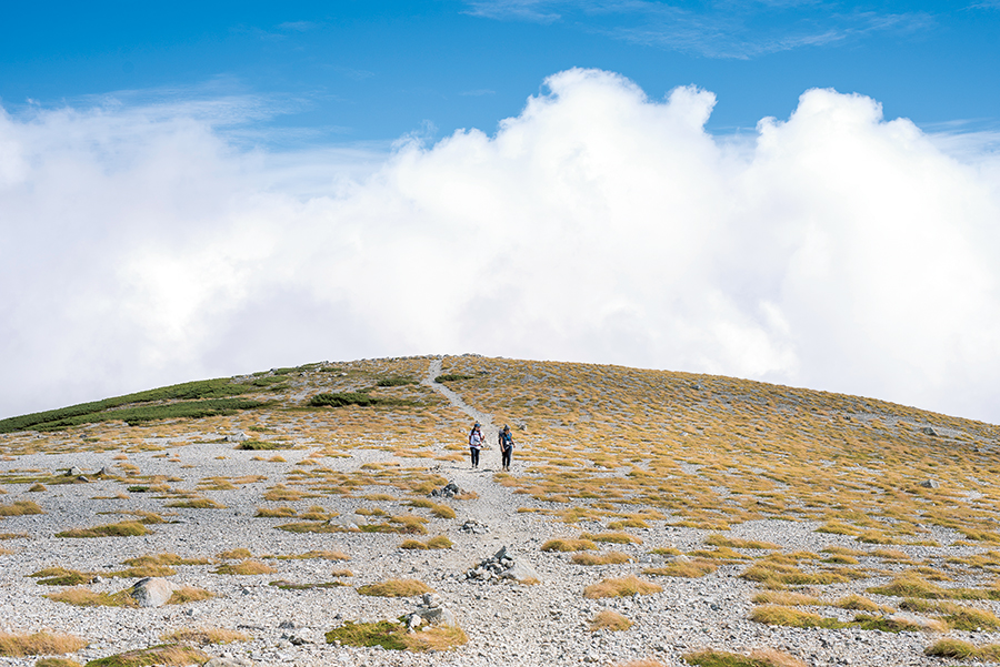 大絶景の広がる鏡平と双六小屋で足を休めたのち、稜線ルートで双六岳の山頂を目指す。今回のルート上で踏む、最初のピークだ。