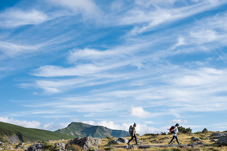 鏡平山荘から先は、とにかく眺望のいいトレイルが続いている。今日は景色も天気も申し分なし。だれもがうらやむ登山日和だろう。足取りはこの日の爽やかな風のように軽やかだ。