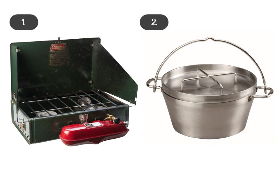 1. ツーバーナー:アウトドア用のふた口ガスコンロ。家庭用のカセットコンロでもまかなえるが、寒さや風に強く火力が安定するのはこのガソリンタイプ(愛用品はコールマン/413Hパワーハウスツーバーナー)