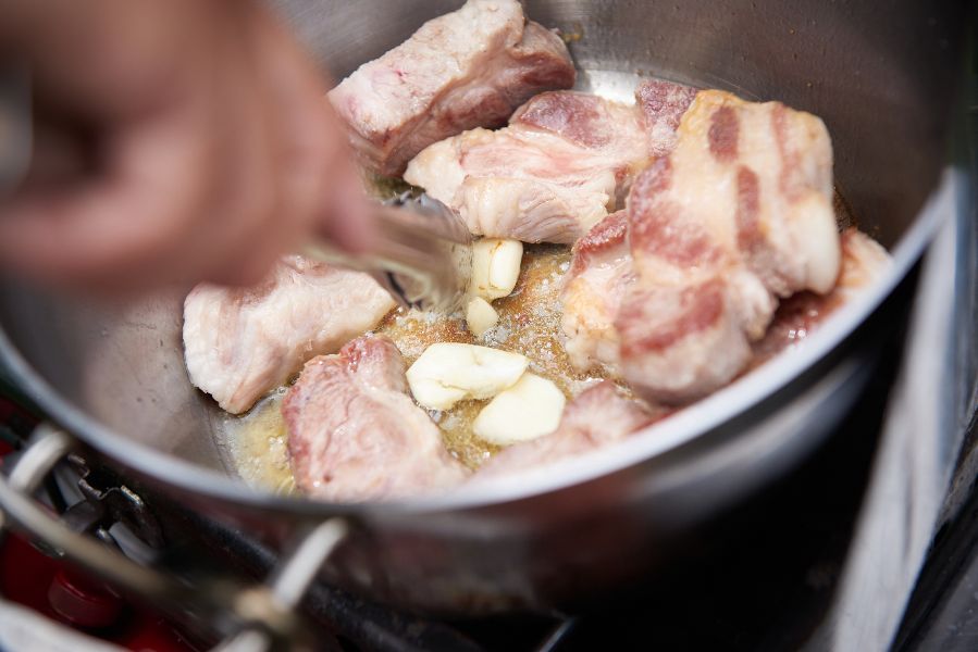 ダッチオーブンを中火で熱し、オリーブ油を入れ、豚肉を少し焦げ目がつくまで焼き、にんにくを加え、30秒ほど炒めて一旦火を止める。