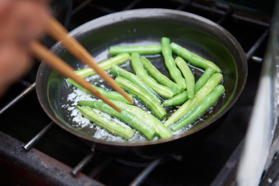 別のフライパンでいんげんをバターで炒めて(4)に加え、ブラックペッパーを振る。