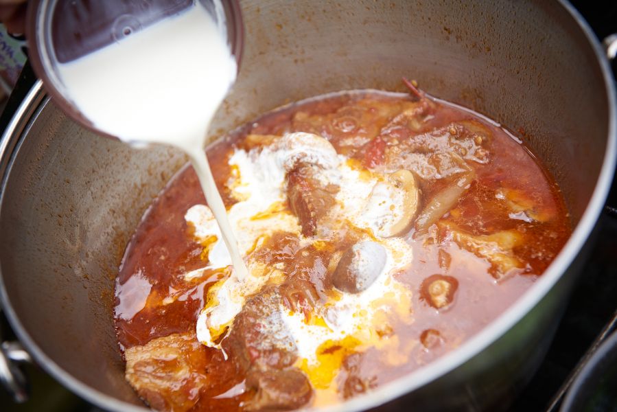 火にかけてほうっておくだけで、ダッチオーブンが圧力鍋効果を発揮して勝手に調理を進めてくれるのがこのレシピのよさ。少し煮込み時間がかかるので、献立のなかで最初に調理をして仕込んでおくとよいと思います。お肉はバラ肉やモモ肉でもおいしく、また余ったソースはパスタに絡めて食べてもいいですよ!