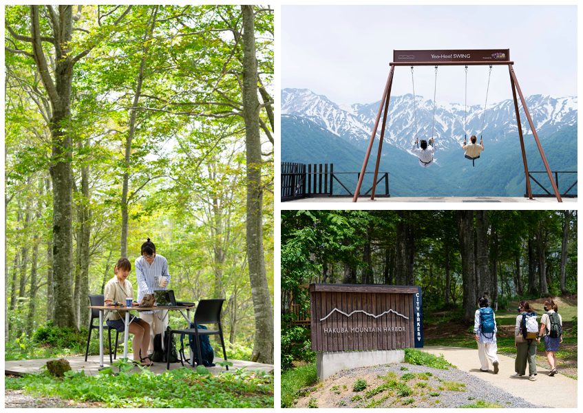 山頂駅から一歩出ると広々としたゲレンデ。その先にそれはあった。樹々の中に点在するウッドデッキとテーブル。そこでコーヒーやビール片手にパソコンを開いている人たち。まるで夢みたいな森のオフィス。展望デッキからは北アルプスがドーンと見える。
