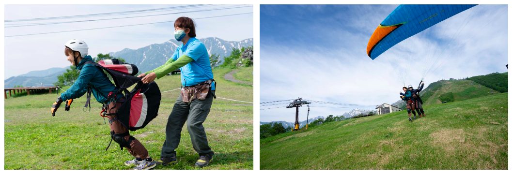プロのパイロットの方とのタンデム飛行。道具を付けてもらって、離陸の練習。なんだかうまくできるのか不安だけど、あとは“いい風”を待つのみ。「さぁ、行きますよ!」合図とともに前に駆け出す。アワアワしているうちに体がふわっと浮いてあっという間に上空へ! 上昇気流に乗ってぐんぐん高度を上げていく私たち。