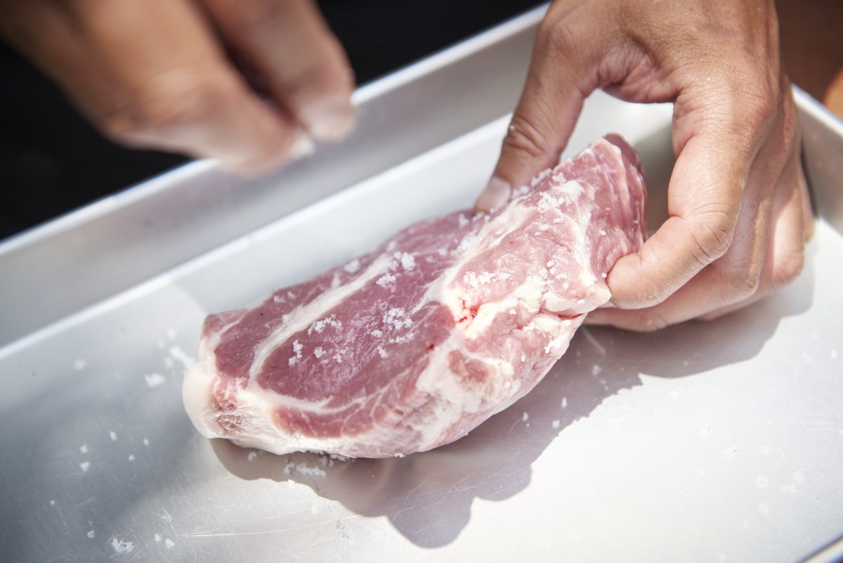炭焼きグリルで炭5個に火をつけ、網から5cmほど離した位置に炭を並べておく。豚肉に塩を振りなじませる。