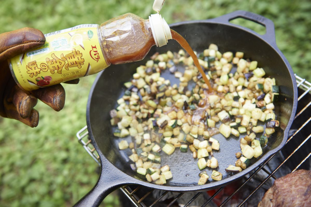 炭火の遠赤外線効果でじっくり火入れすれば、大きな塊肉も失敗なく調理ができます。細かくカットした野菜を丁寧に炒めることで焼肉のたれを余すことなく吸い上げ、お肉と合わせたときのハーモニーは絶品のひとこと。キャンプ料理の主役級レシピです。