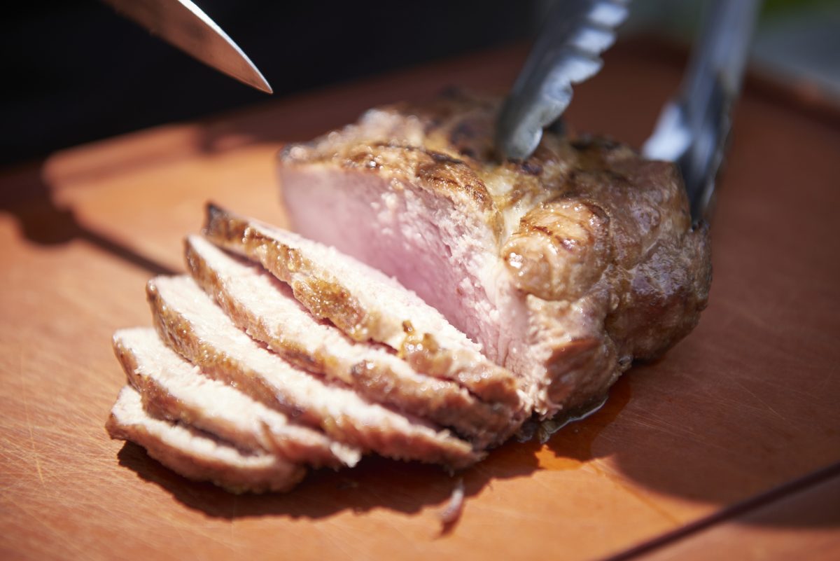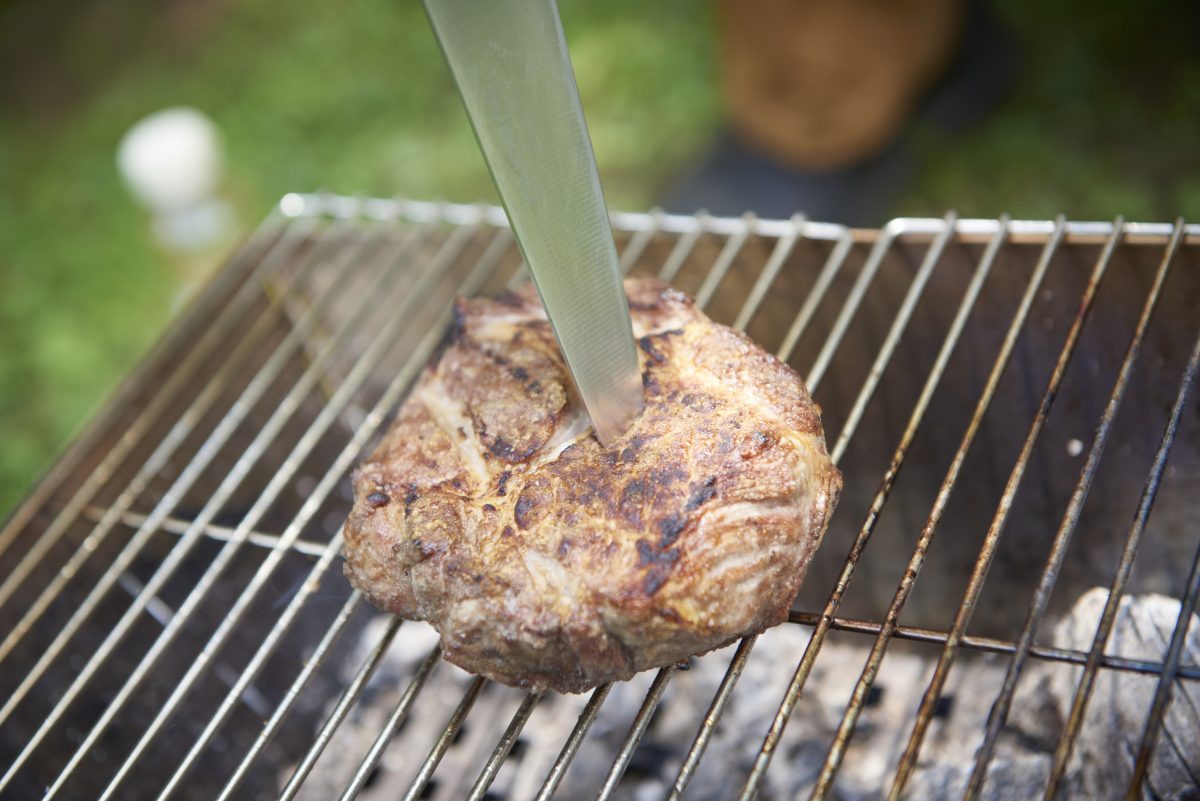 肉の焼け具合はナイフで確認できます。冷たいナイフの先端を焼いたブロック肉の中心に差し込み、少しおいて引き抜いて下唇に当てます。ここで熱いと感じたら中まで火が通っています。