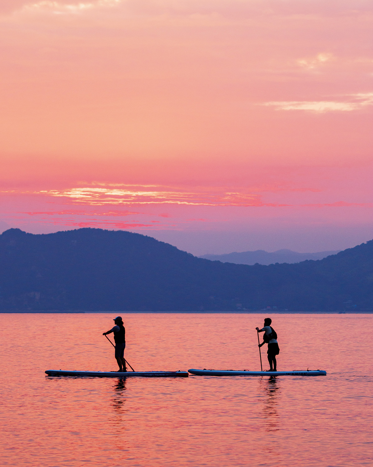 翌朝は4時半に起きてSUPを漕ぎ出し、海の上で日の出を待った。雲は厚かったが、海上は凪いでいた。瀬戸内海の朝凪と夕凪は世界有数のうつくしさだと僕は思う。海面に映る自分の姿を見ているとまるで鏡の上に立っているようで、そのまま水の上を歩けそうだった。