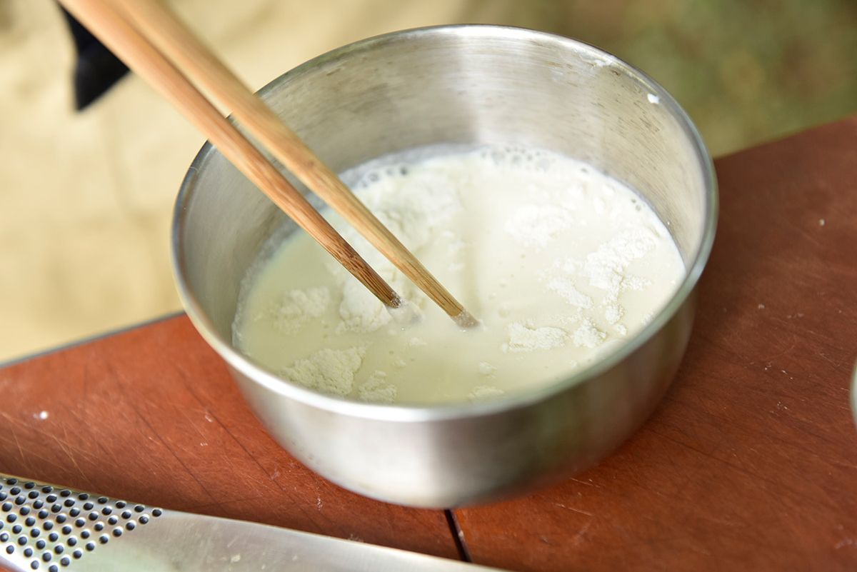 器に小麦粉と豆乳半量を入れ、よく混ぜ合わせておく。エビは殻をむき背わたを取り、身の太い方に切り込みを入れる。
