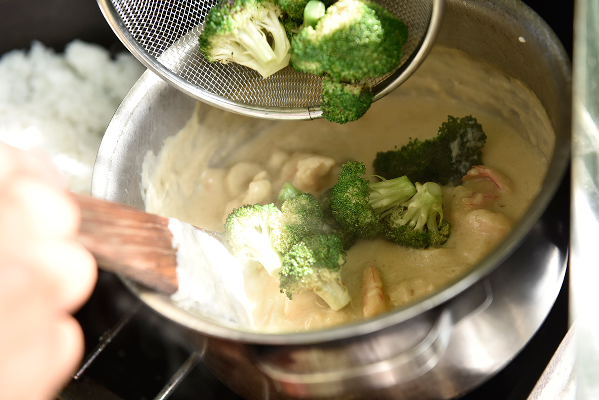 鍋を中火で熱し、バターを入れ、エビ、ホタテ、たまねぎ、エリンギ、ブロッコリーを炒める。ブロッコリーを一旦取り出す。
