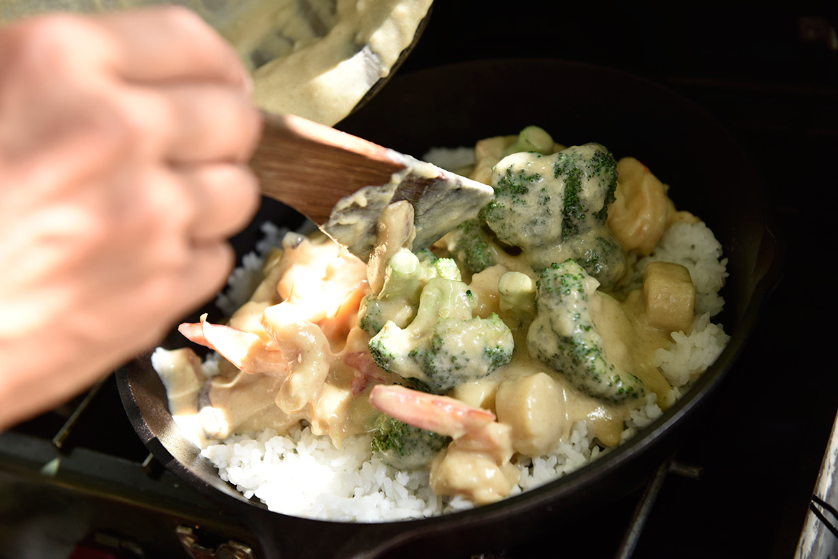 「エバラ食品」×「キャンプ料理の王様」のコラボ企画第25弾は、豆乳とごまを合わせた濃厚な味わいを楽しむ、エビと帆立のお手軽ドリアです。