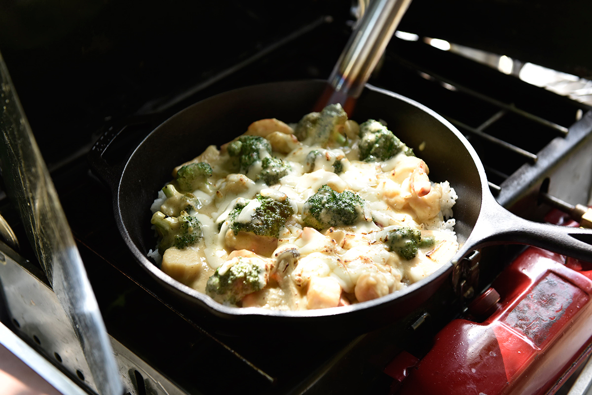 これ1つで味がしっかりと決まる濃厚な「プチッと鍋 担々ごま鍋」は、豆乳やチーズとの相性が抜群。調理はパックごはんで炊飯の手間を省き、オーブンで加熱するのではなく仕上げにトーチで表面を炙るお手軽さ。大人も子どもも、お腹を空かせたキャンプにたまらない一品です。