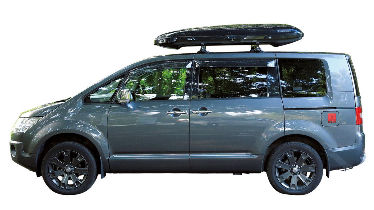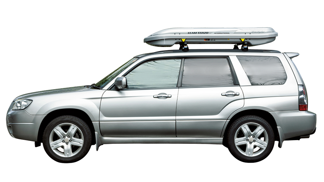 ルーフボックスを使用。キャンプやスキーの道具を積んでも4人乗れる。