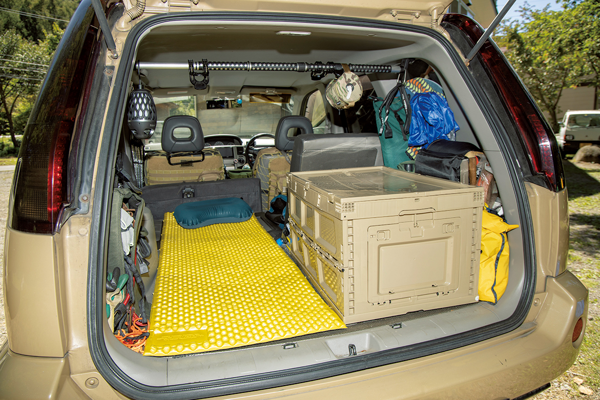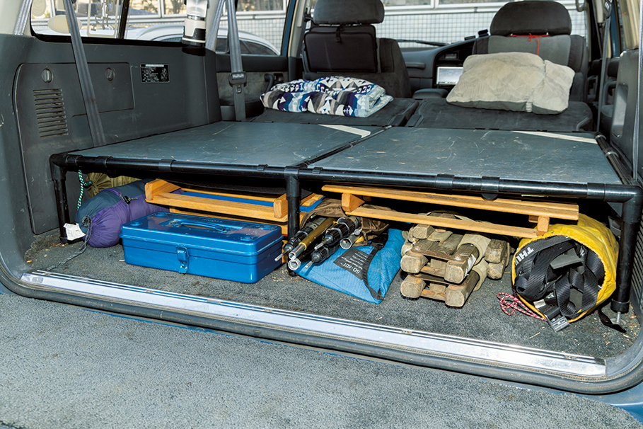 後部座席を倒し、その高さに合わせてシートを自作。下部スペースにはテーブルやチェア、テントやコットを収納。板は外せるので上からも入れられる。