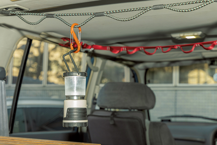 後部座席のアシストグリップにデイジーチェーンを渡して、小物をひっかけられるようにしている。ランタンやスマホなどを室内灯に。