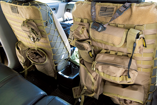 シートにはスミッティービルトのギアケースを装着。用途に合わせたさまざまなポケットが付属しており、好みに応じてカスタムできる。