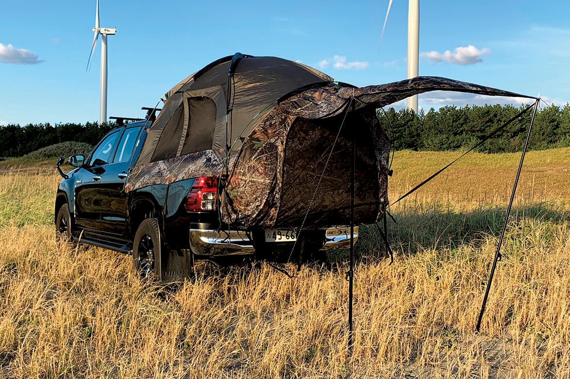 テントはピックアップトラック用のモデルでアメリカの会社から個人輸入したもの。アウトドア用テントと同様の組み立て式で、クルマのボディに固定できるベルトが付属。