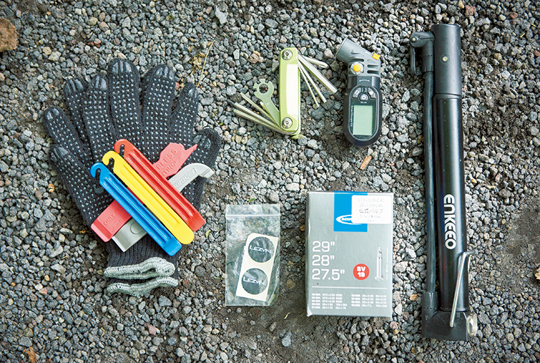 人里離れた場所を走る場合、あらゆるトラブルに対処できるよう持ち物と合わせてスキルも身に着けておく。水と行動食は必須。ほかにパンクや変速機が破損したときに対処できる工具があると安心だ。パンク修理が面倒だったら、スペアチューブを用意する。自分でできないなら、メンテ技術がある仲間と出かければいい。工具やボトルなどは、自転車に直接取り付けるタイプのバッグに入れるのがベター。バッグを背負わず自転車に積めば、体が格段に楽になる。