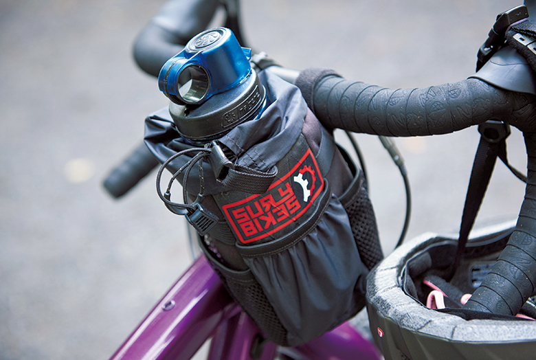 ハンドルの手前に取り付けるタイプの小型バッグは、走行中にボトルを取り出しやすい。多くのブランドから、さまざまな色やサイズの商品が発売されている。