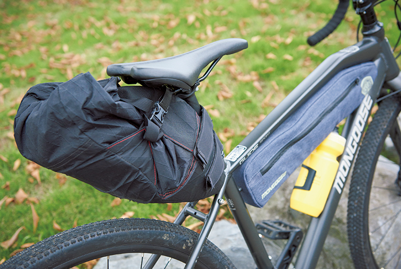 大型サドルバッグは、工具や雨具、食料などを大量に積み込める便利品。大きなものは、後輪の泥よけ代わりにもなる。小物を入れられるフレームバッグも便利。