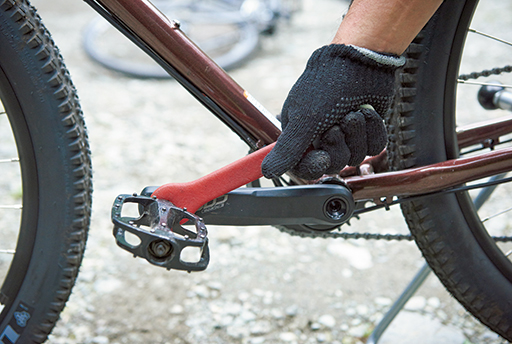 ①ペダルは専用のレンチで外す。左側だけが、「逆ネジ」になっているので注意。左側は、時計回りにレンチを回すと緩む。