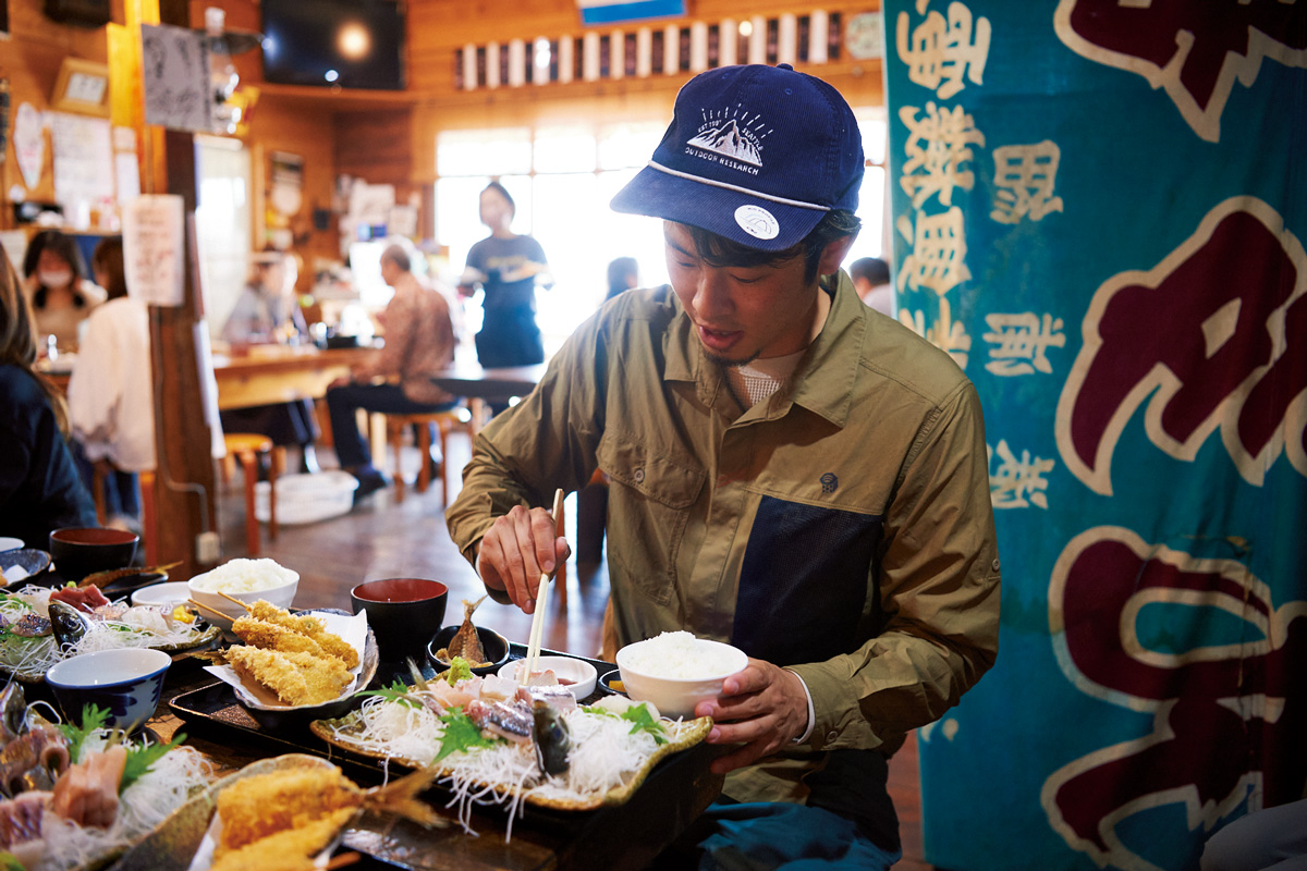 ほどなくして第一目的地である港の食堂に到着。”金目の煮付け”狙いで来たさくぽんだったが、残念ながら売り切れ。でも、新鮮な刺身に大満足のようす。腹いっぱいになったら町ポタリングへ。マイナスイオンが降り注ぐ滝や手湯を楽しみ、食材を買ってキャンプ地へ戻ったさくぽん。ミニベロのE-BIKE、どう?