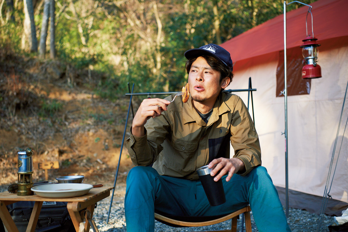 「僕は最近、野鳥観察にハマっています。さっきも近くにいたキツツキを双眼鏡で観ていましたよ。先日は、子どもたちといっしょに双眼鏡片手に鳥を観たり、ハイキングルートでキノコを見つけて”木とキノコの関係(?)”なんかを話したりしましたが、子どもたちは興味津々でした。そういったアクティビティを、ソロキャンプにプラスしていくソロキャンプ第2段階に入ってきたのかもしれませんね」と言う。