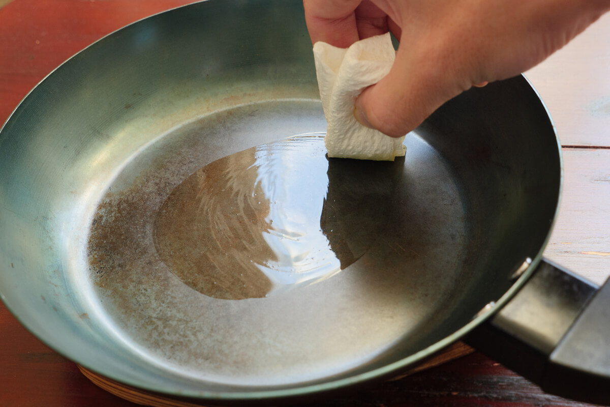 スキレットは鋳鉄製のフライパンで、焦げつきを防止するテフロン加工などは施されていません。そこで新品のスキレットは使用する前に油をなじませるシーズニング処理を施す必要があります。