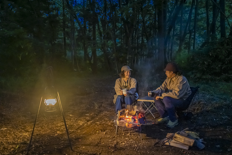 ワインを片手に、オレンジの絞り汁を使ったチキングリルを堪能すると、”10 to 10”の焚き火台「滴火TEKIKA」(¥28,050/取り扱い:myX COSTA)に置いた薪に火をつけた。そこにフライパンなどを置けば、アウトドアならではの焚き火料理も楽しめる。今回は、枝豆を使って、オリーブオイルとニンニクのみじん切り、カレーパウダー、赤唐辛子と一緒に火にかけた。ベアボーンズ「レイルロードランタン」(写真下中/¥9,680)を少し離れたところに置けば、虫が誘われて人から遠ざかるので自然と虫除けになる。