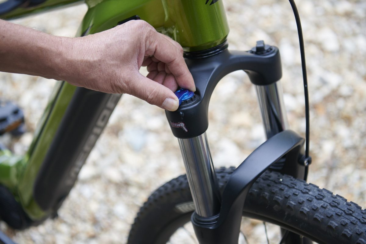 フォークにはロック機構が付き、ペダルを漕いだときにロスとなるバイクの上下運動を抑制。舗装路でロックさせれば、ムダな動きを抑えてスムーズに走れる。