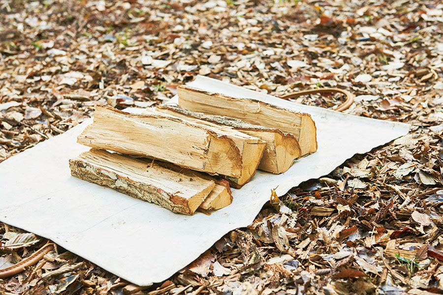 冬は地面が濡れていることが多く、薪を直置きすると湿ってしまいます。枝にひっかけたり、布の上に置いて濡らさないようにしましょう。代用品としてビニール袋も使えます。