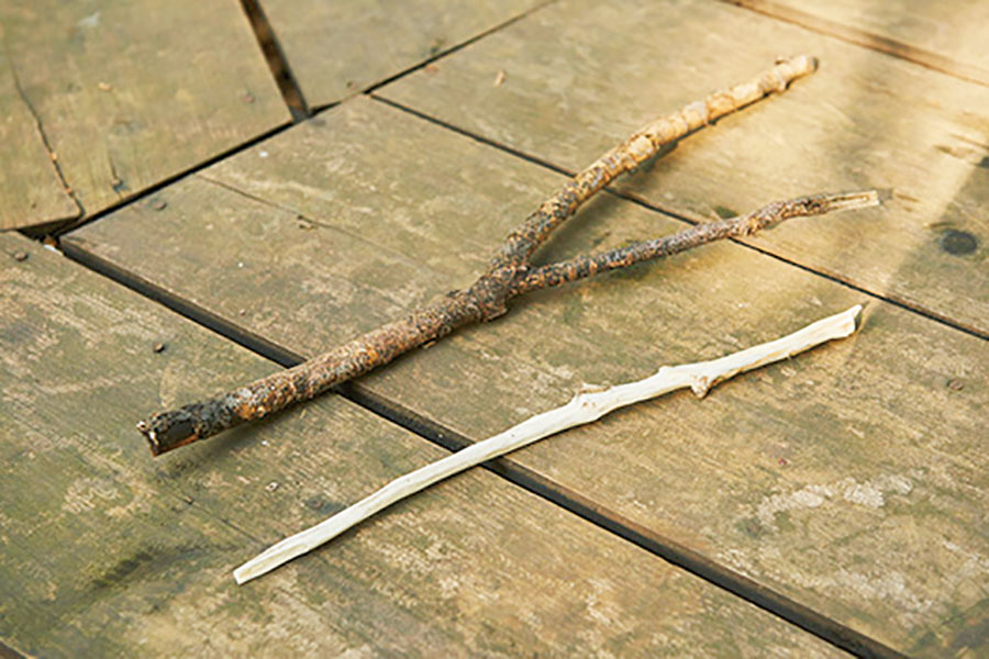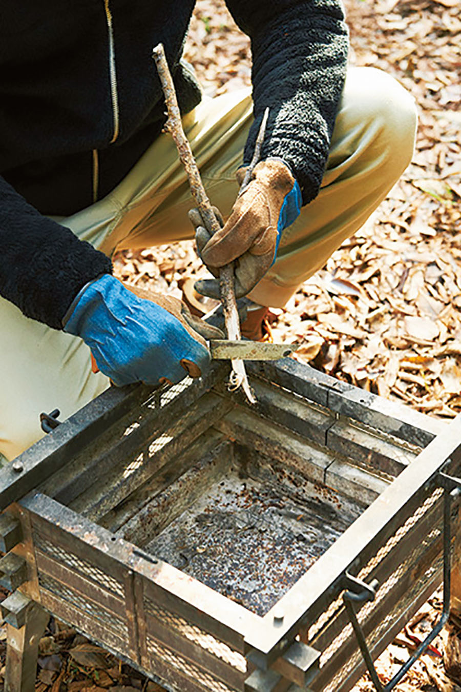 焚き付け用の枝が湿っている場合は、小型ナイフで皮を剥きましょう。表面が濡れていても中は乾いています。剥いだ皮も細かくなることで、乾きやすく燃えやすくなります。