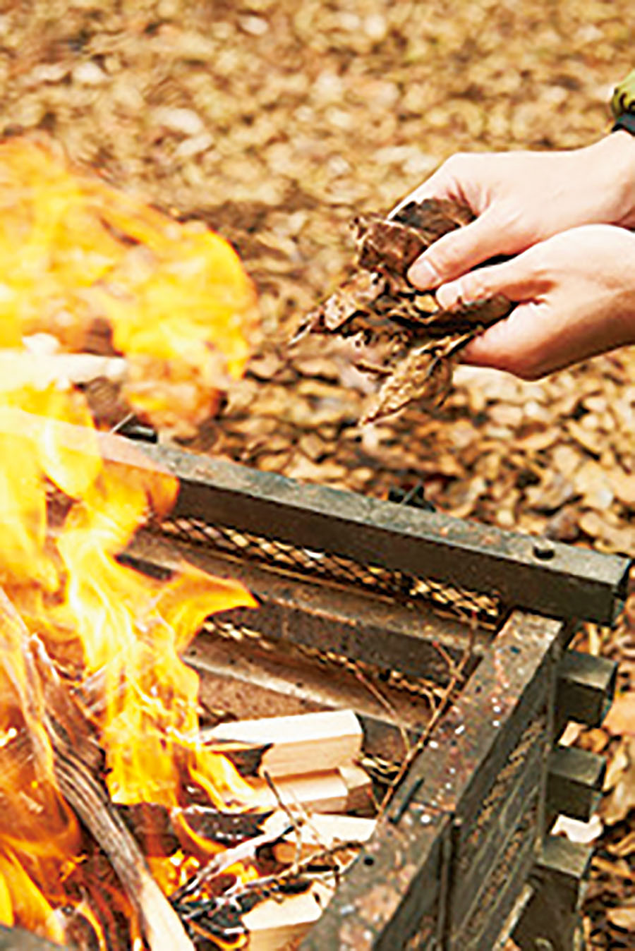 市販されている薪も完全には乾いていないので、焚き火台の周りに置いて、なるべく乾かしてから投入してください。乾かしている薪に燃え移らないように、つねに見ておくことも大事です。
