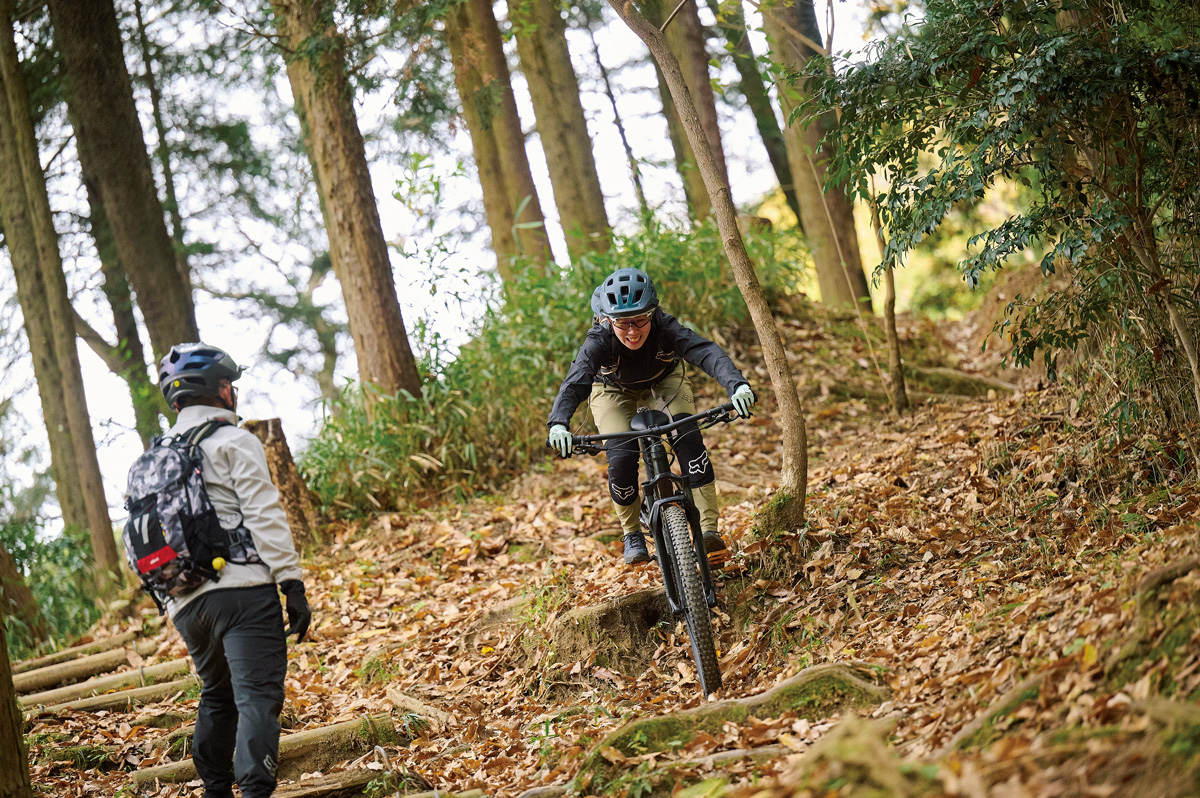 フィールドはほぼ同じながら、登山で歩くスピードや感じる風とは違うトレイルライディングに、加藤は満面の笑みとシリアスな表情を交互に見せる。「まだまだドキドキするけど、『ここ、足を地面につかずに行けるかな?』と思った場所がスッと通過できるとすごく気持ちいい!」と加藤。「そう!トレイルライディングの楽しさは、ちょっとドキドキする場所があるところです。なので、僕は〝完全に安全なところ〞ばかりは案内しません。そのために専用ウエアを身に付け、プロテクターもしっかり装備してもらいます。そうすれば、少しくらい転んでも平気ですからね」と柴谷先生。