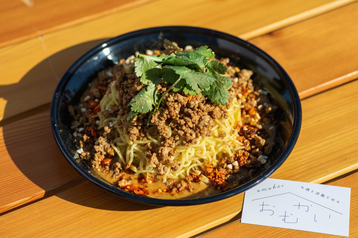 まずは1の坦々ソースをお皿に流し入れ、その上に3の麺、そして2の肉味噌をのせる。あえて混ぜないことで見た目にも美しく、興味をそそる。味の濃さを自分で調節できるのも楽しい。美味しさのなかの少しの楽しさがキャンプ料理らしさを演出する。