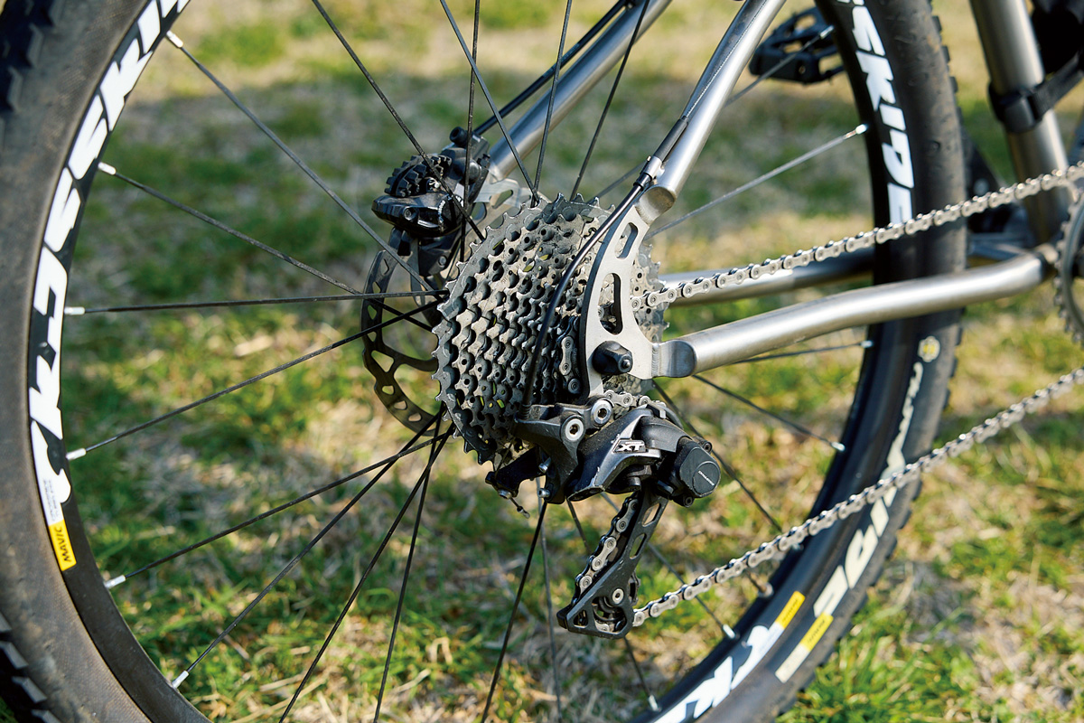 彼の乗るセブンサイクルズは1997年に設立されたアメリカンブランド。ブランド創設時からフレームに高価な素材であるチタンを採用し、小雀さんはシリーズのなかでもっともシンプルなストレートチューブ(パイプの厚みが均一)を使うソラSというモデルを駆っている。セブンサイクルズのフレームは、自分の好みに合わせたフルカスタムオーダーができることでその筋の人に有名なのだ。「26、29、27.5インチ……とホイールサイズは時代とともに変化し、僕が付けているのは27.5インチ。初めて乗った26インチと比べると、ハンドリングはクイックすぎずダルすぎず。そして、このチタンフレームはペダルを漕ぐとスゥ〜と滑らかに進む。フロントはシマノのXTRでシングルギヤ、リアも同じくシマノのデオーレXTで11速。今日のルートには内陸部に激坂もあり、ゆったり旅をするにはちょうどいいギヤ」と言う。