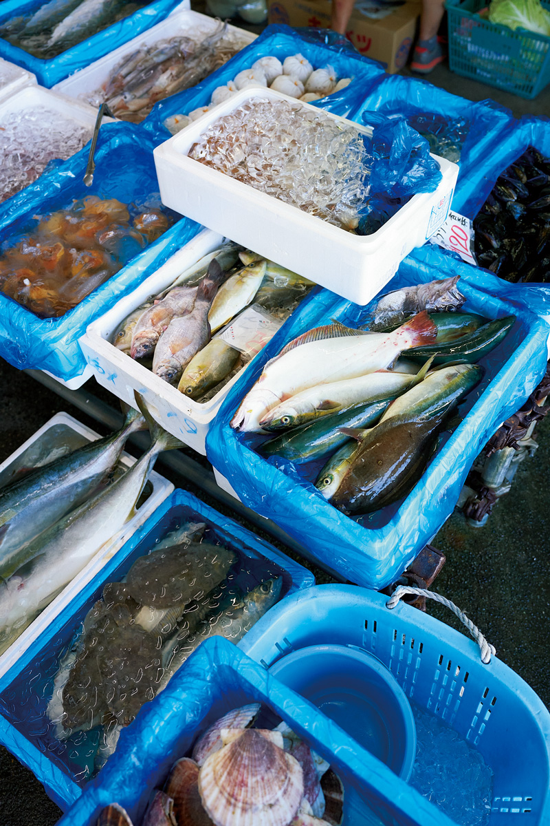 八戸で前泊し、三陸鉄道普代駅で下車。ここから旅が始まるが、トレイルに入る前にまずキャンプの買い出し。せっかくなら地元の海産物を手に入れたいと思い、駅から徒歩10分ほどの嵯峨商店に向かう。店に並ぶ鮮魚はどれも安くておいしそう。だがしかし、外気温は35℃、歩くみちのりはまだまだ長い。保冷バッグを持ってきたが、果たして鮮魚を持ち歩けるか。