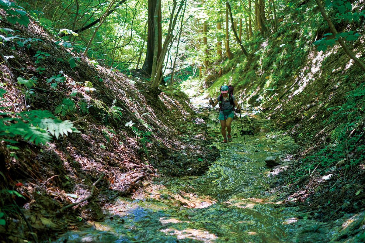 木漏れ日が射し込む静かな森を歩く。夏場は歩かれていないのか、草が勢いよく茂っている。途中で沢に下り、ざぶざぶと渡渉し水を被る。陽は当たらないが標高が低くて暑いので沢歩きが心地いい。1時間ほどで沢を抜け、