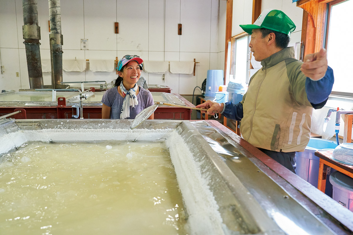 道中に昔ながらの製法で塩をつくっている「のだ塩工房」があるので訪ねてみた。工房のある野田村では古くから海水から塩がつくられていて、牛の背に乗せて内陸へ運び穀物と交換していたそう。その当時から受け継がれてきたのが「直煮製法」という海水を窯で炊いて結晶化させるつくり方で、100%海水の自然海水塩ができあがる。職人さんがじっくり5日間、手塩にかけてつくった塩をペロリと味見してみると、角がなく、まろやかな甘みが感じられる優しい味わい。汗をたっぷりかいた身体に染みわたる。
