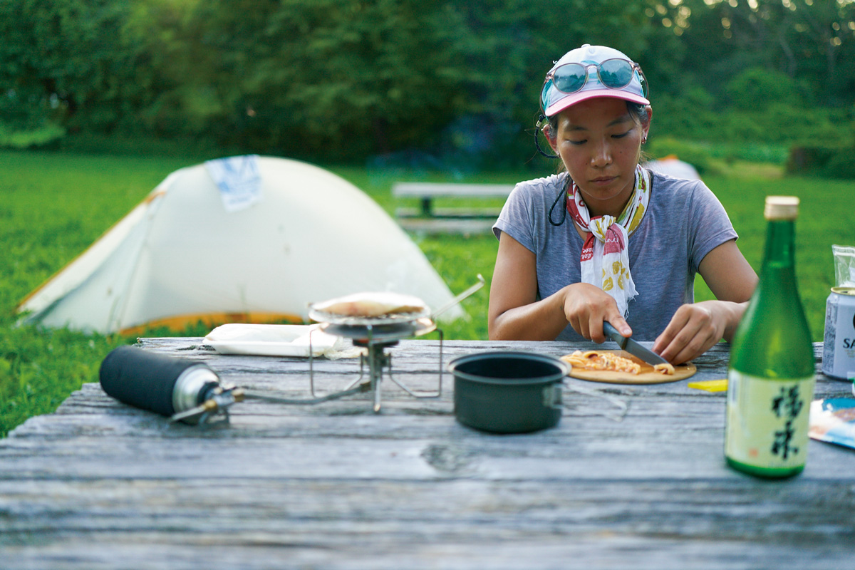のだ塩工房からさらに40分ほど歩き、1日目のゴールである玉川野営場に到着。芝生が広がる気持ちのいいサイトには水場やテーブルが設置され、使い勝手もいい。出発前に購入した冷凍ホヤはまだ凍っていて、鮮魚の状態も問題なさそうだ。この地で獲れた最高の食材は素材の味が活きるシンプルな料理がいちばんだ。生ホヤの刺身とカレイの塩焼き、そしてスルメイカのパスタ。三陸の旅でこそ味わえる、ぜいたくな晩餐に、1日中歩いた疲れも癒された。