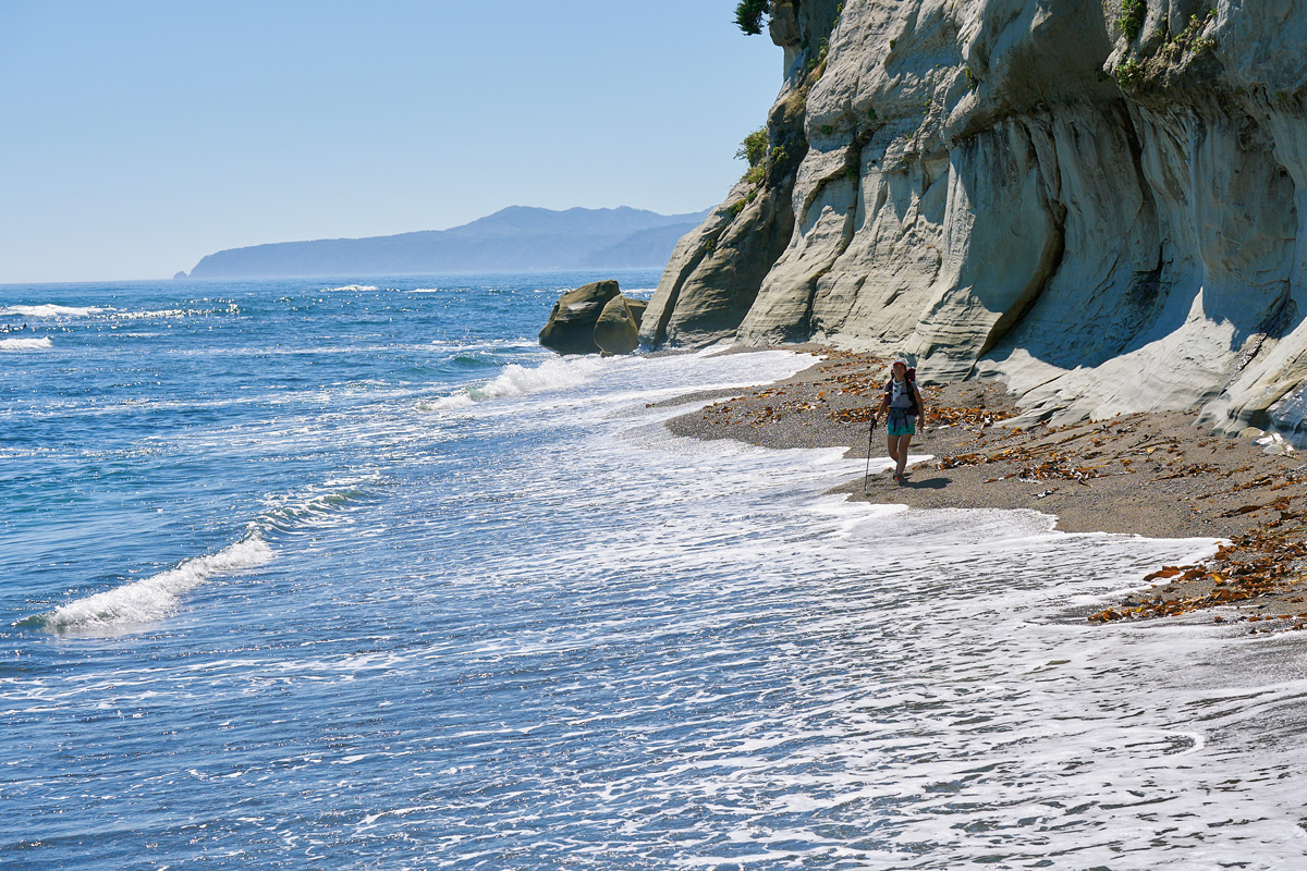道の駅からしばらくは海岸線の道路歩き、その後は海辺に降り立った。波を足に被りながら歩くトレイルは最高に気持ちがいい。ざぶざぶと足を濡らしながら、ときには上半身まで濡らすほどの高波も被るが、それがこのトレイルの醍醐味だと思う。躊躇せず積極的に濡れるぐらいがちょうどいい。海辺の〝ごほうびトレイル〞を存分に楽しんだ。