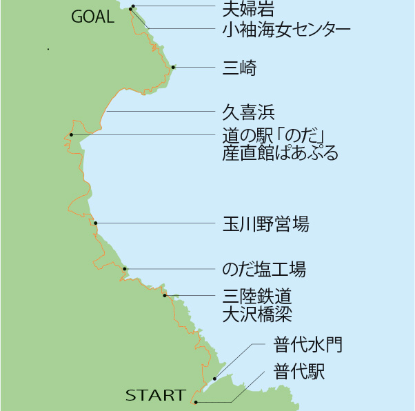 福島県相馬市から青森県八戸市までの太平洋沿岸をつないだ全長1,025㎞に及ぶロングトレイル。今回はトレイルの1区間である岩手県の普代駅からスタートし、小袖海女センターまでをつないで歩いた。2 日目は5 時間以上の峠越えもあり、エスケープルートもないのでかなりハードだ。