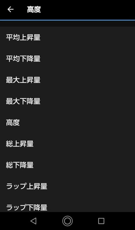 6)各項目で表示させたいデータは、タイマー、距離、スピードなどをタップすると、さらに細かく分類されている。高度であれば、上画像のように多種。実際に試してみれば、要不要がわかるだろう。たとえば、筆者は登坂時に「総上昇量」を表示させていたが、「平均上昇量」の方が、ヒルクライム時のペースがわかって便利そうだと、今回の旅サイクリング後に変更している。