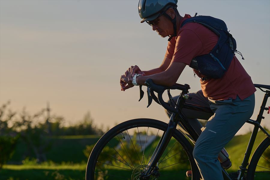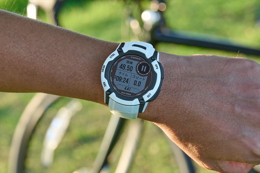 「Instinct 2X Dual Power」なら電池がなくなる心配もなく、モバイルバッテリーを追加する必要なく、腕に装着してデータを確認、ペースを守ってサイクリングが楽しめる身軽さがいい!