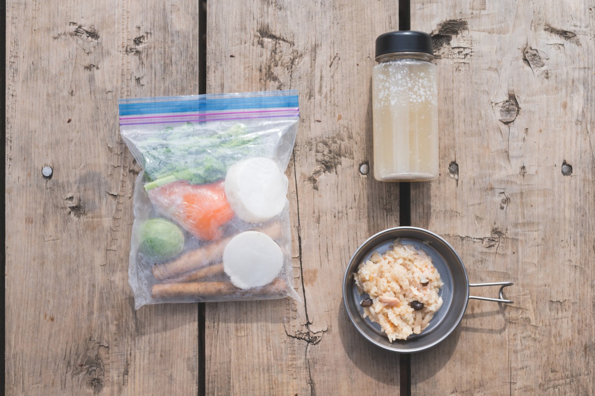 食材は、家である程度カットしてきている。山登りでは、もはやこれをしない手はないというほど当たり前のアイデア。好きなものを持ってこれて、時短にもなるし、バックパックの中身を減らすこともできる。また、使った密閉式ビニール袋に生ゴミを入れられたりもするので、”一石五鳥”くらいにはなるはず。
