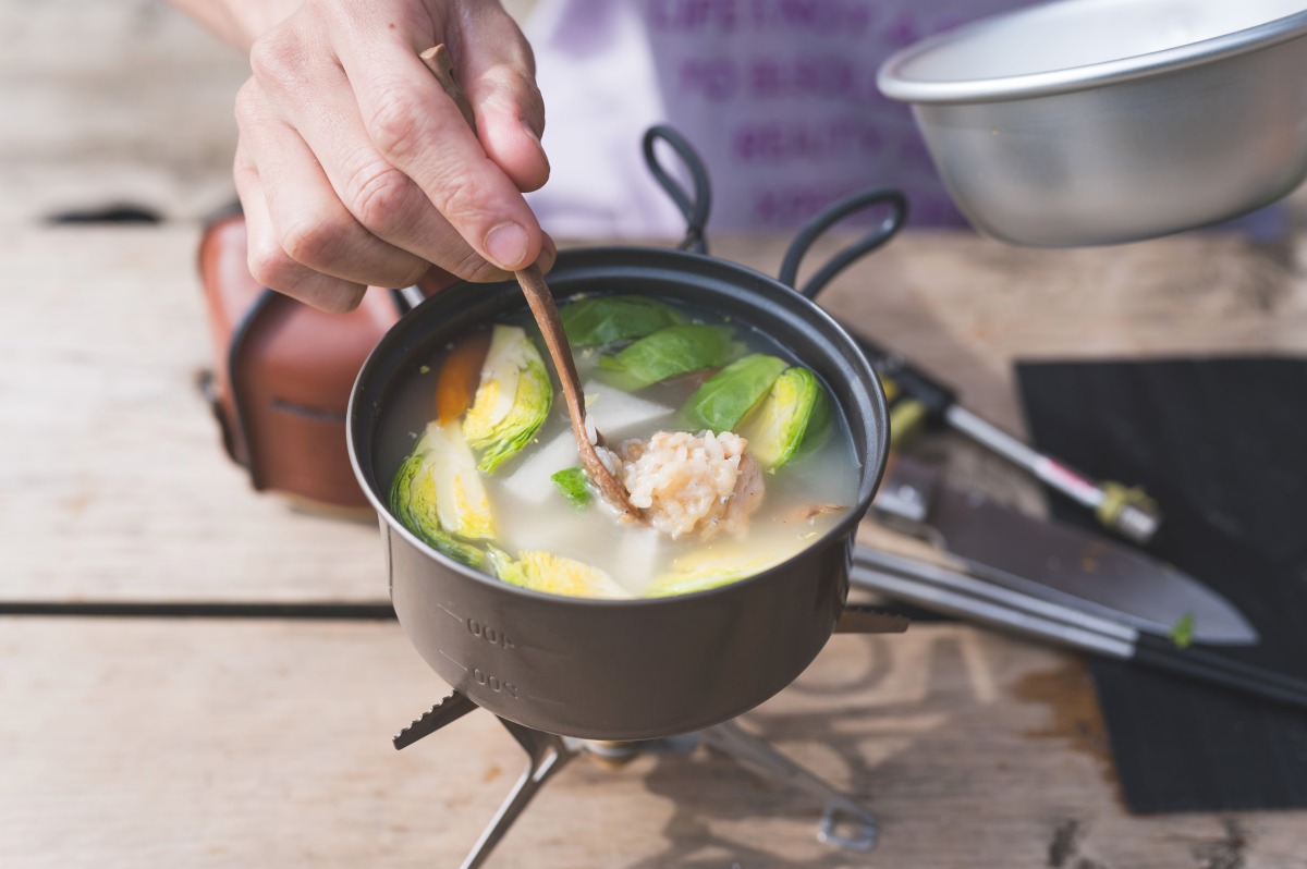 山に登っていつも思うのは、温かいスープのありがたさである。夕食でも朝食でも、その温かさに心がほぐれる。そんなスープをレトルトではなく、もちろん簡単に、さらには残り食材を使って作れるとしたら、これほどありがたいことはない。今回は、前回紹介した「柿の種の山おこわ」を使ったアレンジレシピ。ぜひお試しあれ!