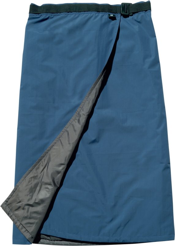 男性にもおすすめのレイン用巻きスカート。着脱が速く、突然の降雨に重宝し、土砂降りの嵐じゃなければレインパンツよりも快適。長さ調節付きで、広げればグランドシートとしても使える。軽量でバックパックに常備したいひと品。