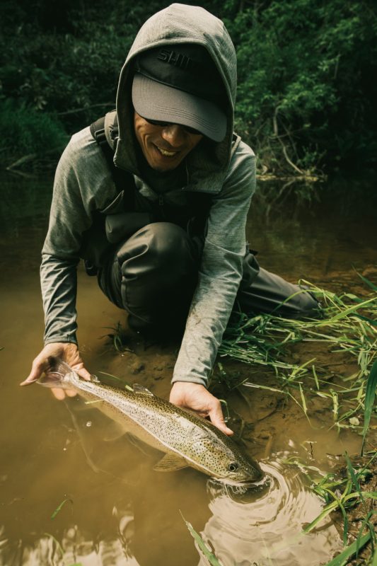 たまに水面を魚がばちゃばちゃっと跳ねるが、肝心のルアーをなかなか食べてくれない。蔭山さんも僕もじりじりとしてくる。そんななかで結果を出したのは、やはり地元アングラーの坂本さんだった。